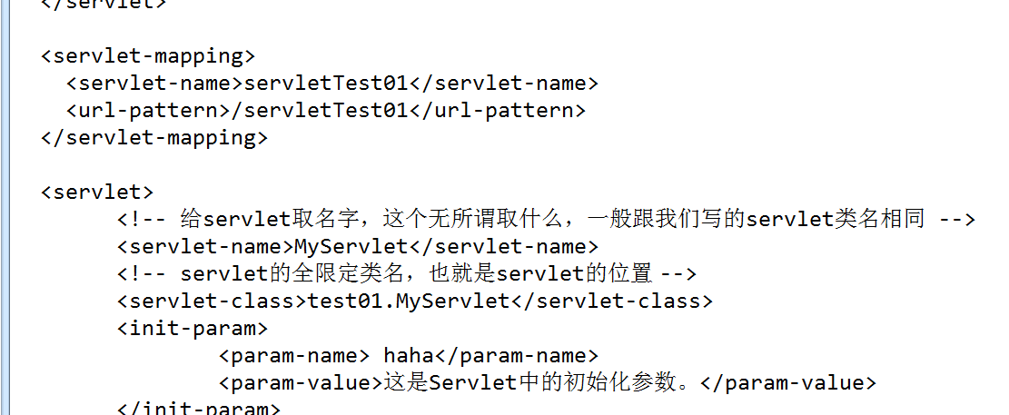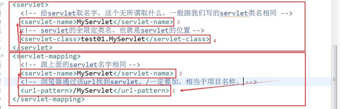 按照步骤,首先浏览器通过http://localhost:8080/test01/MyServlet来找到web.xml中的url-pattern,这就是第一步,匹配到了url-pattern后,就会找到第二步servlet的名字MyServlet,知道了名字,就可以通过servlet-name找到第三步,到了第三步,也就能够知道servlet的位置了。然后到其中找到对应的处理方式进行处理。