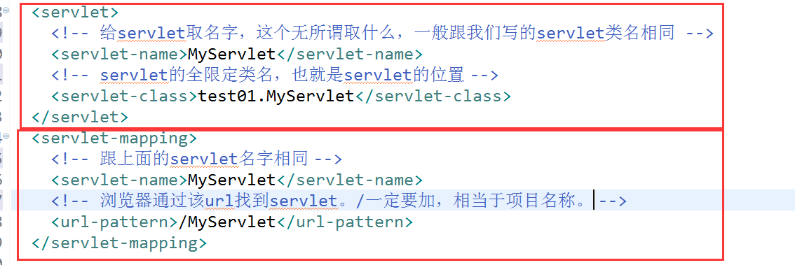2、在web.xml中配置MyServlet,为什么需要配置?让浏览器发出的请求知道到达哪个servlet,也就是让tomcat将封装好的request找到对应的servlet让其使用。