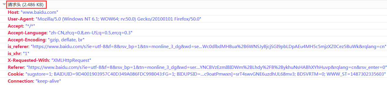 随便百度一个东西,然后查看的请求头,包括以下这些内容,稍作了解。