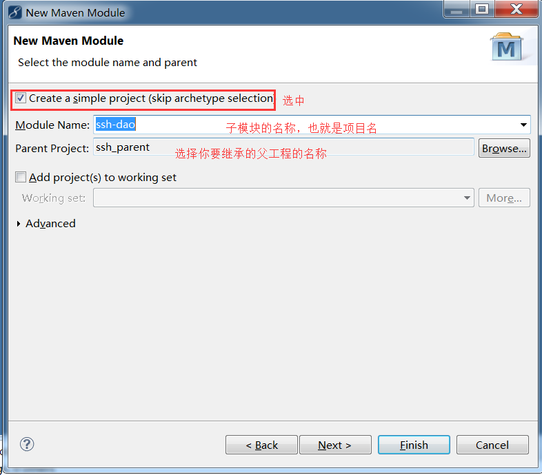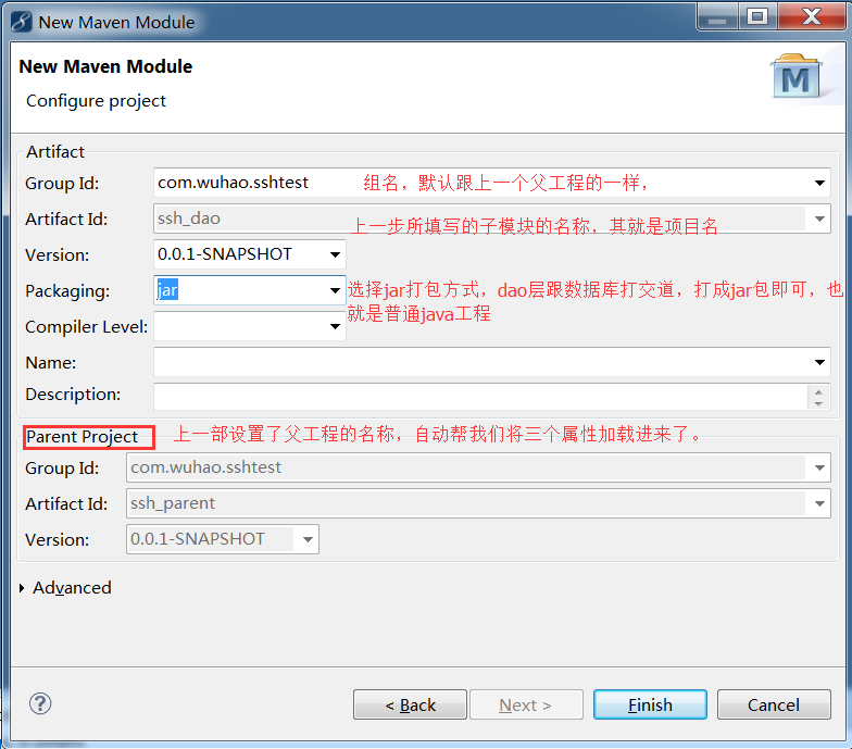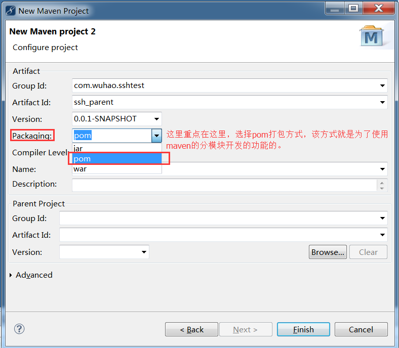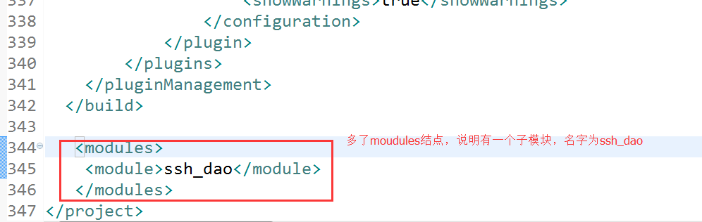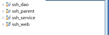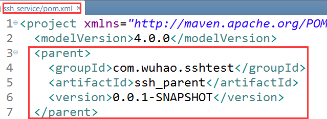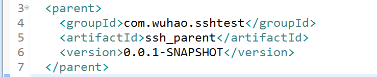 和前面一样,ssh_parent的pom.xml中增加一个module结点,而ssh_web的pom.xml中增加一个parent结点