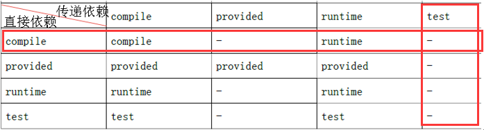 按照刚才上面的例子,来看看在B中,junit的作用范围是什么?首先看B 依赖 A,直接依赖,并且A在B中的作用范围是compile(没设置就默认),所以在直接依赖这一列中找到compile这一行,也就是用红色框框框起来的一行,然后B 依赖 junit,对A来说,A 是传递依赖 junit,这时候看junit设置的作用范围是多少(也就是看junit在B中的使用范围是什么)?看传递依赖这一行,junit设置的是test,找到test这一列,看相交的地方,是空的,则说明,junti在B中的test范围不能够使用,其实看图,B中任何范围内都不能够使用junit,这样你就理解了这张图是什么意思。这只是原理,实际上我们解决这种问题的时候,用一个简单粗暴的解决方案。什么jar包丢失了,我们就再次导入一次jar包即可。