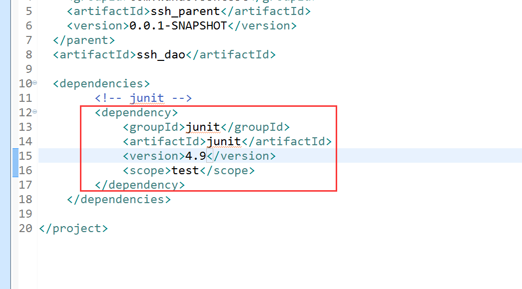 所以在ssh_dao子模块的pom.xml中有junit的坐标才能使用test