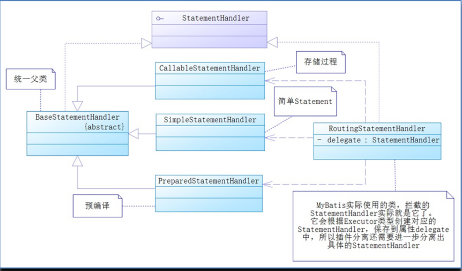 - RoutingStatementHandler:是一个具体实现类.在这个类中并没有对Statement对象进行具体使用.只是根据得到Executor类型,决定创建何种类型StatementHandler对象.在MyBatis工作时,使用的StatementHandler接口对象实际上就是RoutingStatementHandler对象.我们可以简单理解为