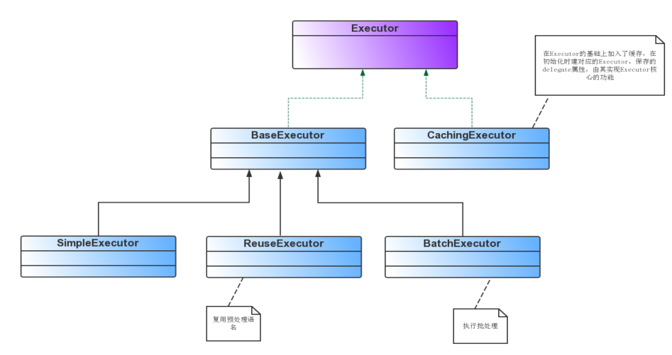 - Executor接口:有两个实现类BaseExecutor、CachingExecutor