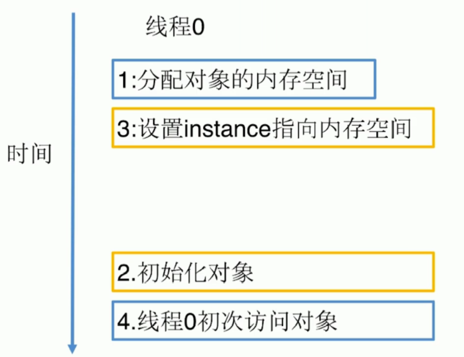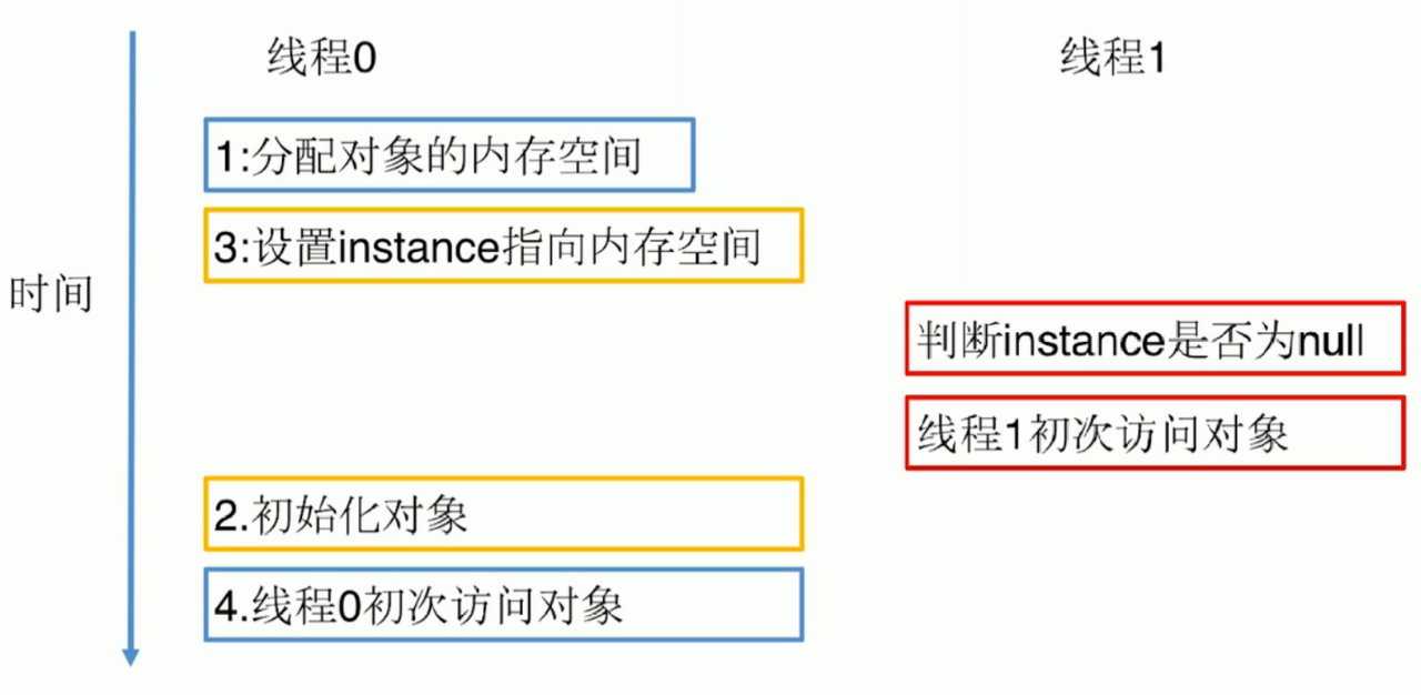 如图,对于线程0步骤2和步骤3进行重排序并不会影响最后的结果。但是对于线程1就不一样了。当线程0执行步骤3之后线程1进入对象是否为空的判断,此时对象并没有完成初始化,但是对象已经被设置了内存空间,所以判断是否为空时不为空,这时候线程1就会执行return操作也就是步骤4,然而拿到的是一个没有初始化的完成的对象。