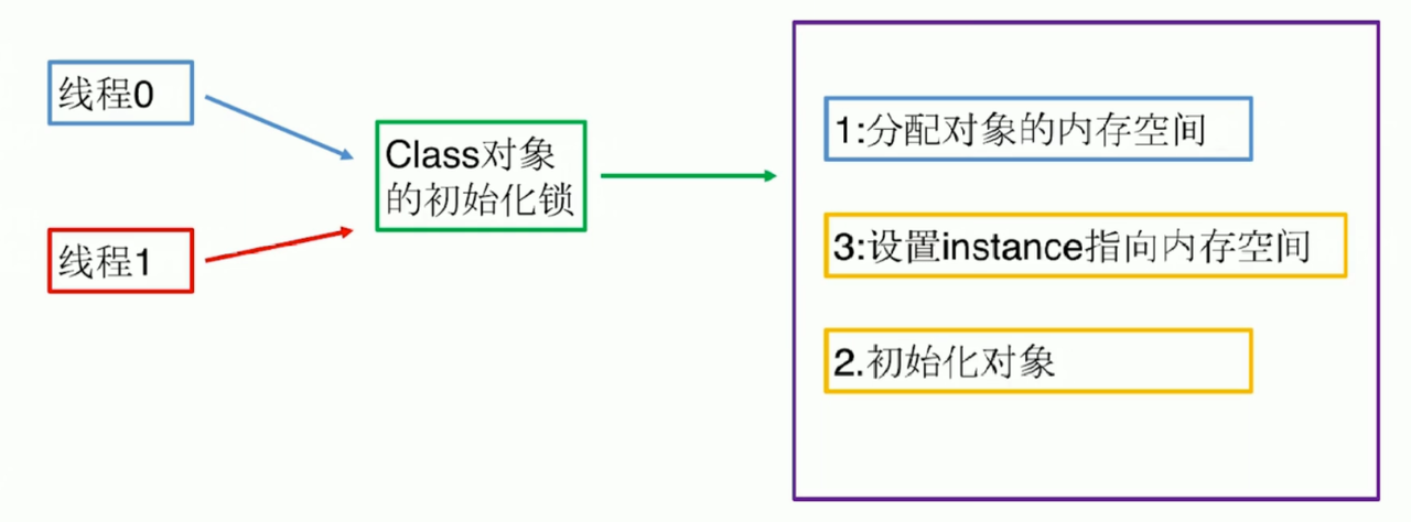 类在初始化的阶段:也就是类在加载并且在线程使用之前,jvm在类的初始化阶段会获取一个类初始化的一个锁,这个锁会同步多个线程对一个类的初始化。示意图如下,当线程0在执行时,对于线程1是不会看到的。