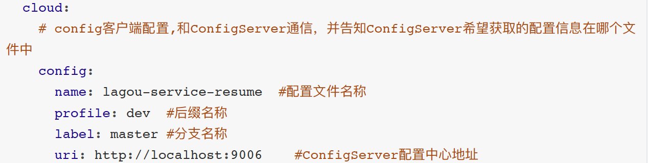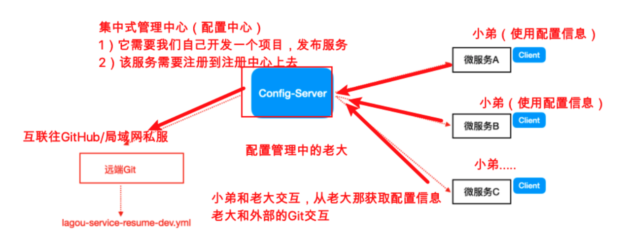 - Config Server是集中式的配置服务,⽤于集中管理应⽤程序各个环境下的配置。 默认使⽤Git存储配置⽂件内容,也可以SVN。