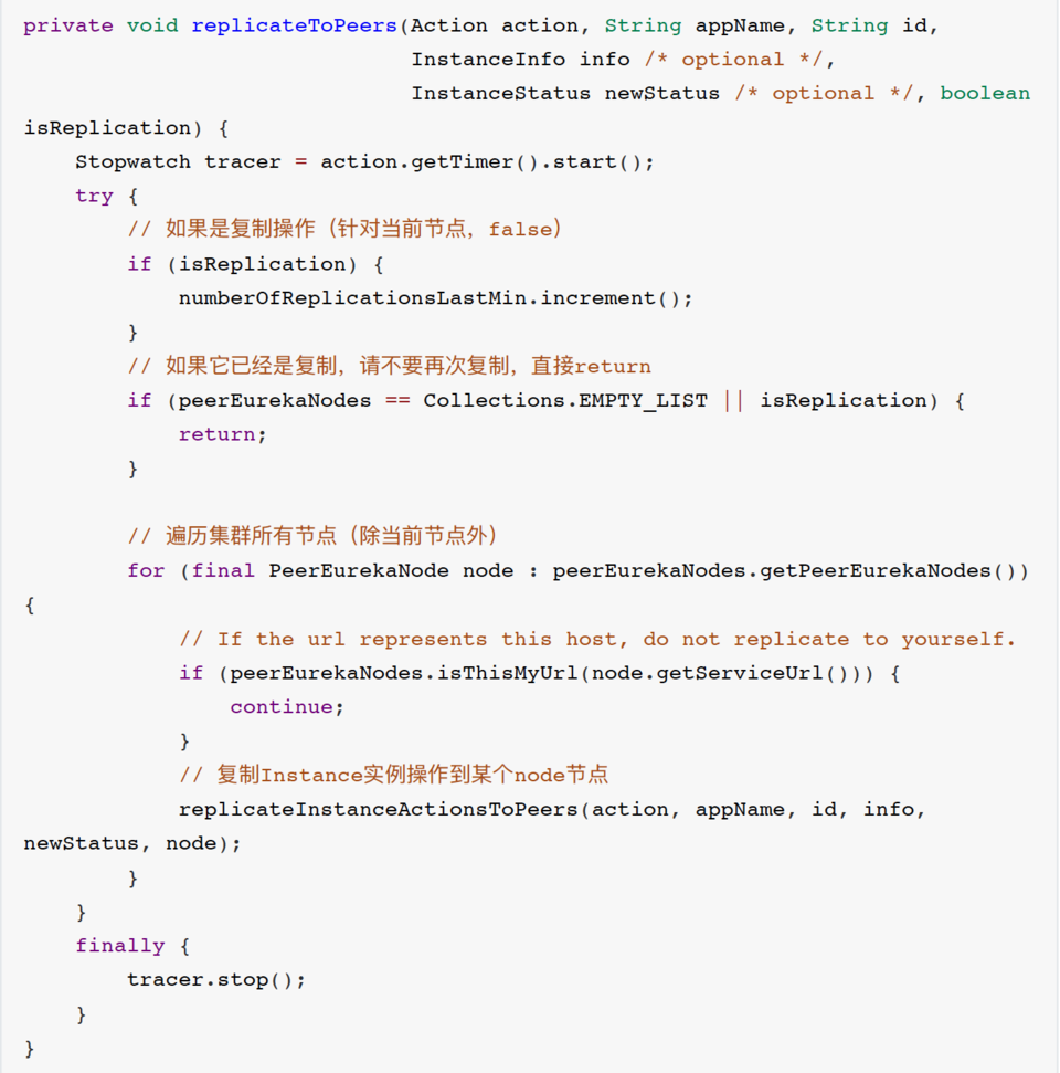 - com.netflix.eureka.registry.PeerAwareInstanceRegistryImpl#replicateToPeers#replicateInstanceActionsToPeers 复制Instance实例操作到其它节点