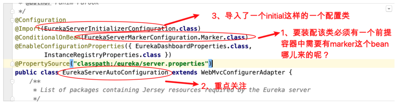 - ⼊⼝:SpringCloud充分利⽤了SpringBoot的⾃动装配的特点,使用了SPI机制,在boot启动时装载了EurekaServerAutoConfiguration⾃动配置类,如下: