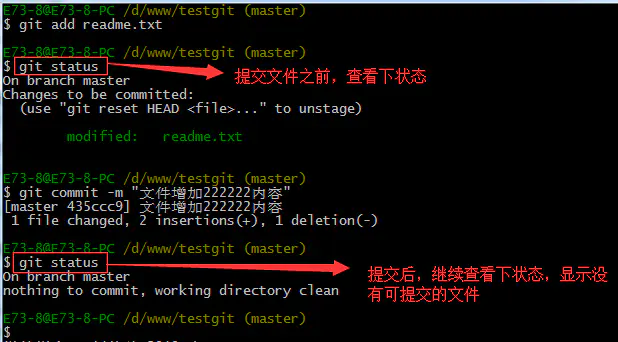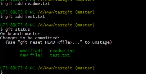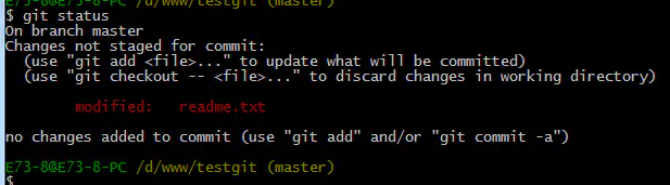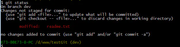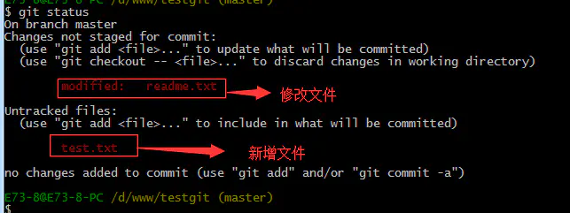我们在readme.txt再添加一行内容为4444444,接着在目录下新建一个文件为test.txt 内容为test,我们先用命令 git status来查看下状态,如下: