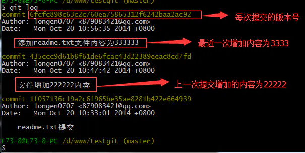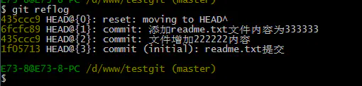 git reset –hard 版本号 ,但是现在的问题假如我已经关掉过一次命令行或者333内容的版本号我并不知道呢?要如何知道增加3333内容的版本号呢?可以通过如下命令即可获取到版本号:git reflog 演示如下: