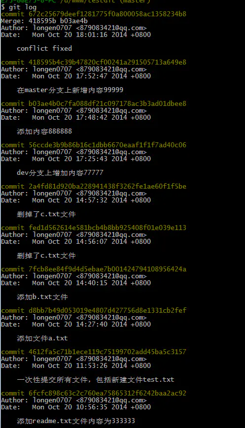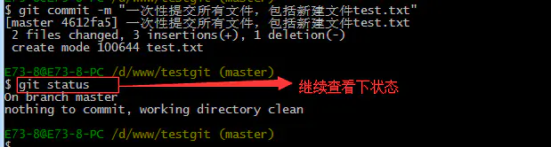 假如我现在版本库testgit目录添加一个文件b.txt,然后提交。如下: