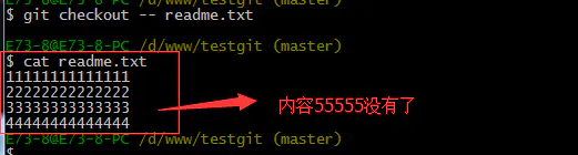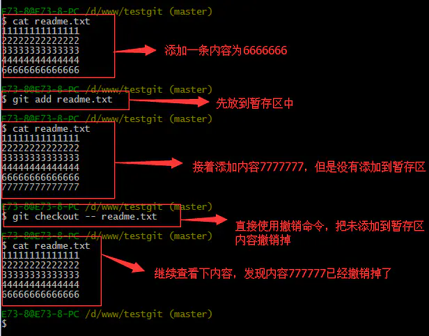 对于第二种情况,我想我们继续做demo来看下,假如现在我对readme.txt添加一行 内容为6666666666666,我git add 增加到暂存区后,接着添加内容7777777,我想通过撤销命令让其回到暂存区后的状态。如下所示: