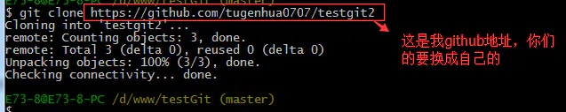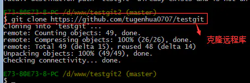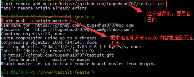 现在,我们根据GitHub的提示,在本地的testgit仓库下运行命令: