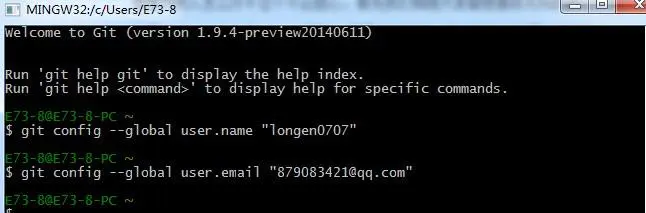 **注意:**git config –global 参数,有了这个参数,表示你这台机器上所有的Git仓库都会使用这个配置,当然你也可以对某个仓库指定的不同的用户名和邮箱。