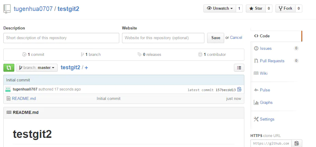 首先,登录github,创建一个新的仓库,名字叫testgit2.如下: