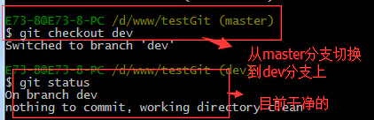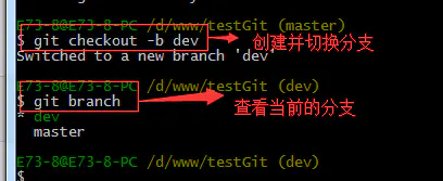 首先,我们来创建dev分支,然后切换到dev分支上。如下操作: