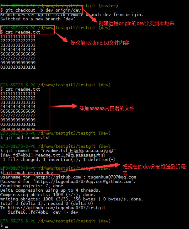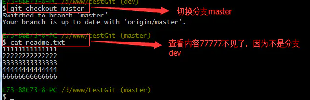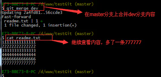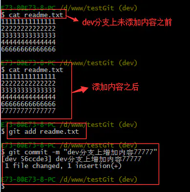 git branch查看分支,会列出所有的分支,当前分支前面会添加一个星号。然后我们在dev分支上继续做demo,比如我们现在在readme.txt再增加一行 7777777777777