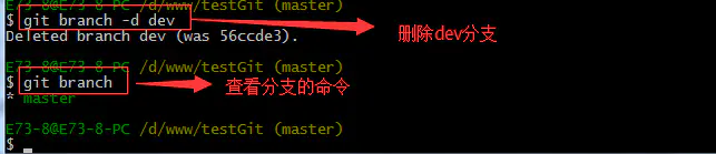 合并完成后,我们可以接着删除dev分支了,操作如下: