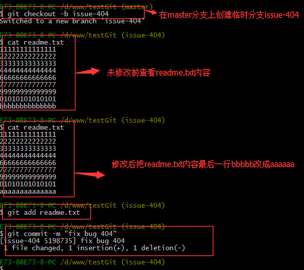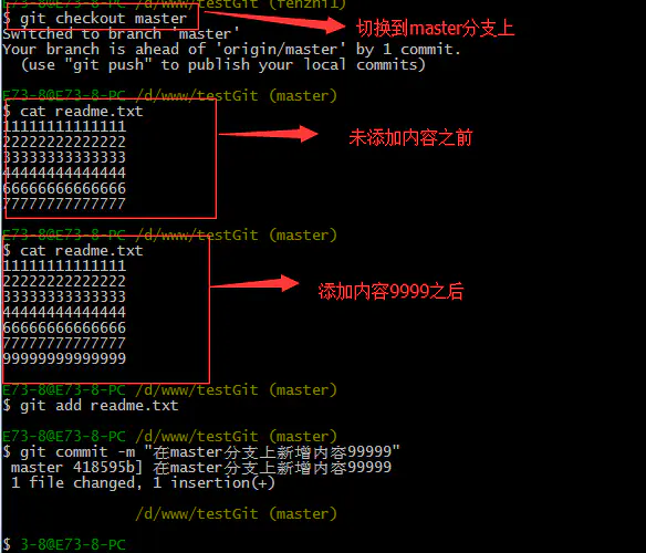 下面我们还是一步一步来,先新建一个新分支,比如名字叫fenzhi1,在readme.txt添加一行内容8888888,然后提交,如下所示: