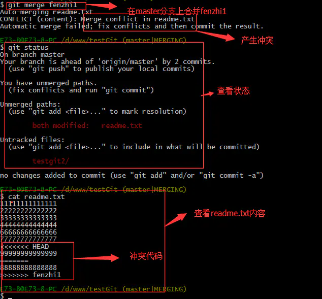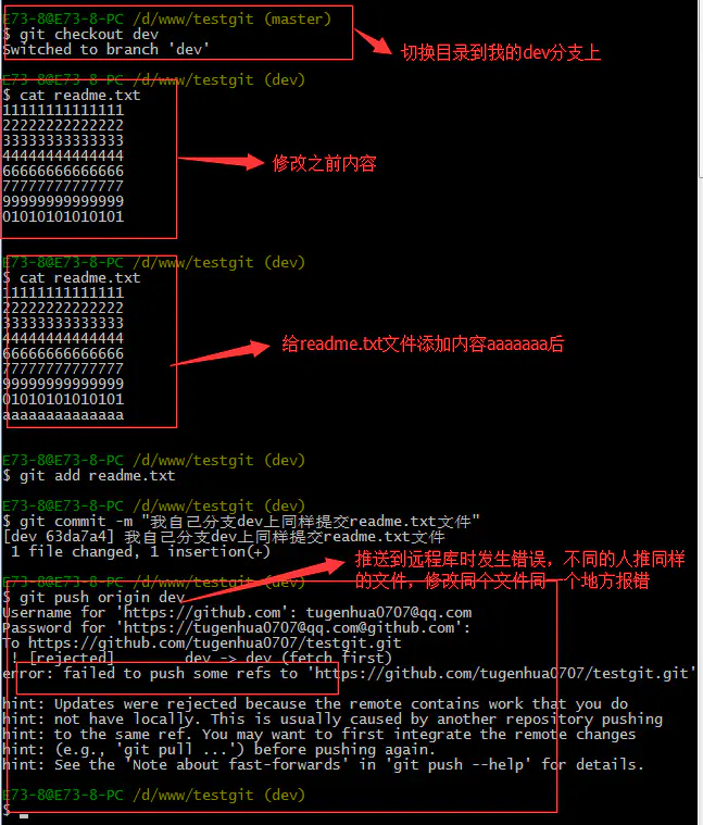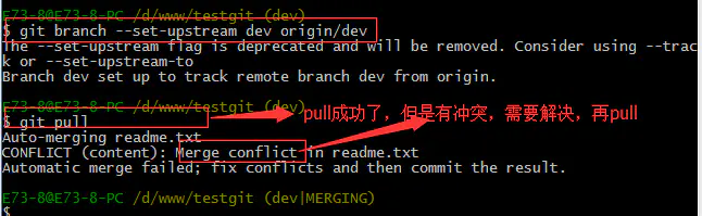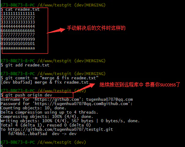 3、 如果合并有冲突,则需要解决冲突,并在本地提交。再用git push origin branch-name推送。