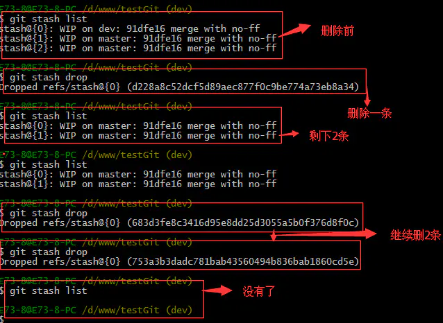 1、 git stash apply恢复,恢复后,stash内容并不删除,你需要使用命令git stash drop来删除。