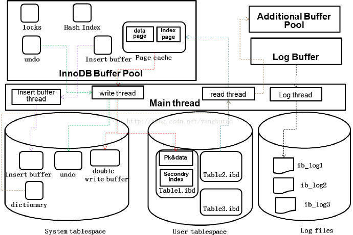 在数据结构方面,innodb包括表空间、段、区、页/块,行。索引结构是B+tree结构,包括二级索引和主键索引,二级索引的叶子节点是主键PK,根据主键索引的叶子节点指向存储的数据块。这种B+树存储结构可以更好的满足随机查询操作IO要求,分为数据页和二级索引页,修改二级索引页面涉及到随机操作,为了提高写入时的性能,采用insert buffer做顺序的写入,再由后台线程以一定频率将多个插入合并到二级索引页面。为了保证数据库的一致性(内存和硬盘数据文件),以及缩短实例恢复的时间,关系型数据库还有一个checkpoint的功能,用于把内存buffer中之前的脏页按照比例(老的LSN)写入磁盘,这样redolog文件的LSN以前的日志就可以被覆盖了,进行循环使用;在失效恢复时,只需要从日志中LSN点进行恢复即可。