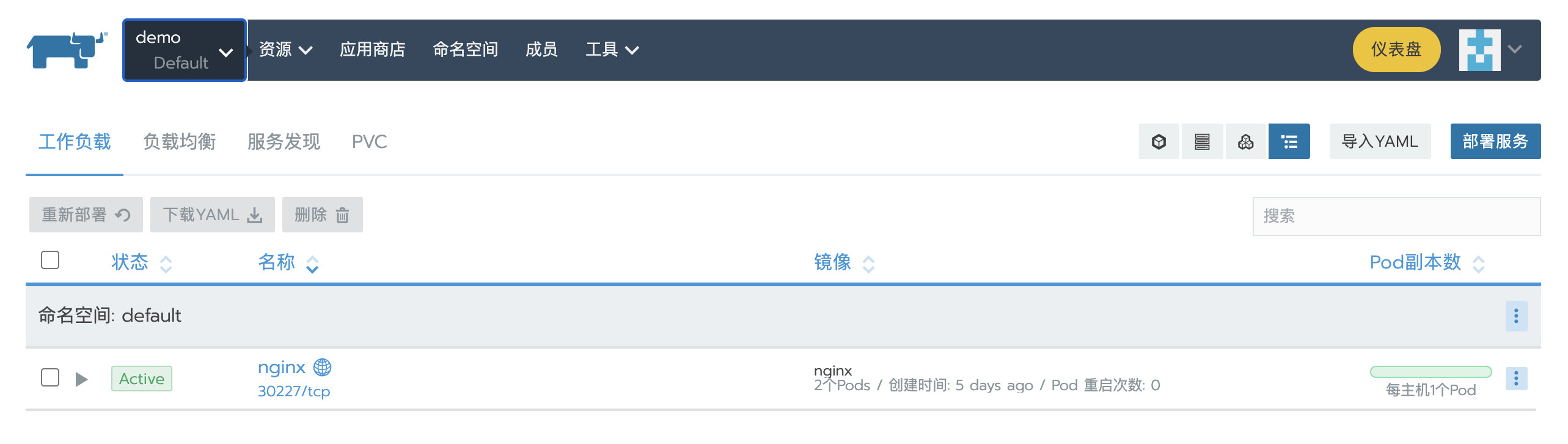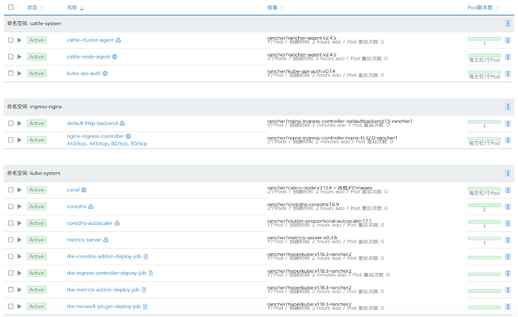 通常情况下,通过RKE创建的custom集群应包括以下workload: