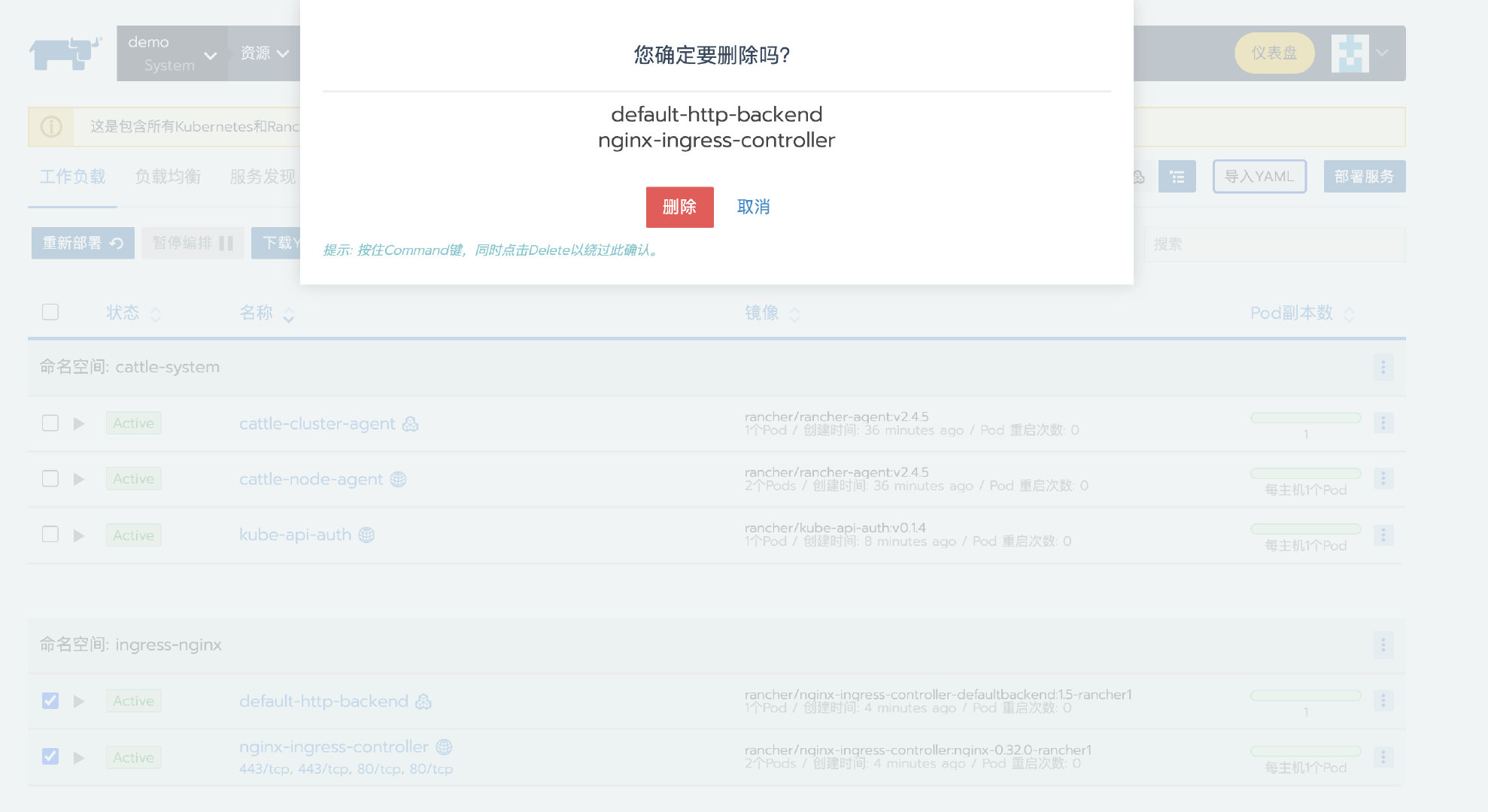 从System Project下删除kube-system 下的default-http-backend和nginx-ingress-controller