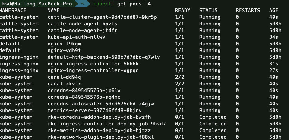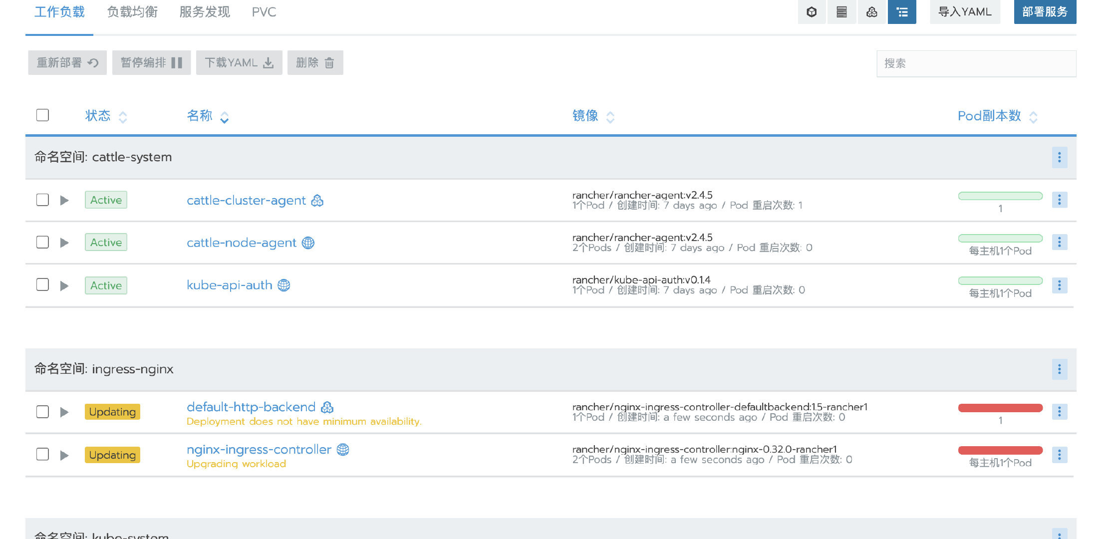 nginx-ingress-controller、canal、coredns、metrics-server 这些workload都是通过kube-system命名空间下的各种job来创建的,所以如果要重建这些workload只需要重新执行对应的job即可。