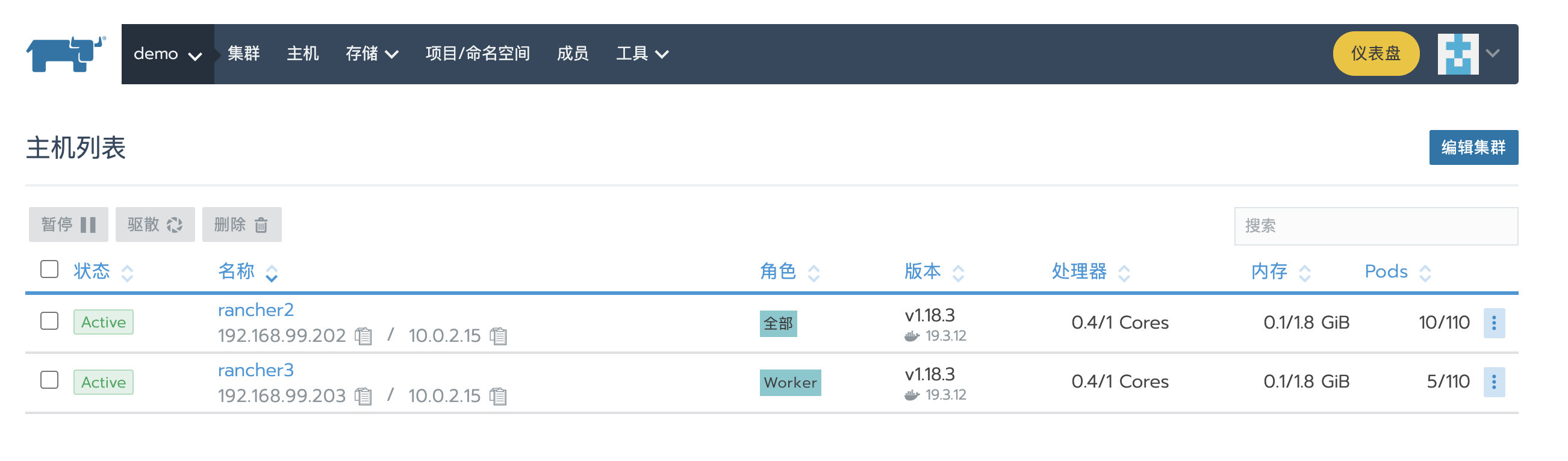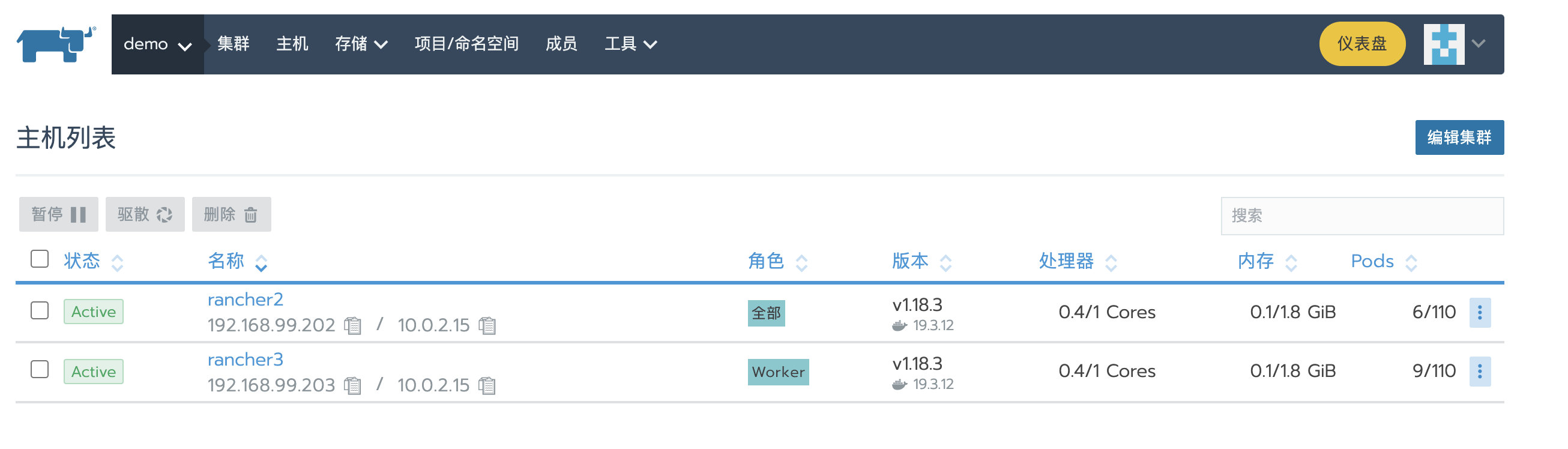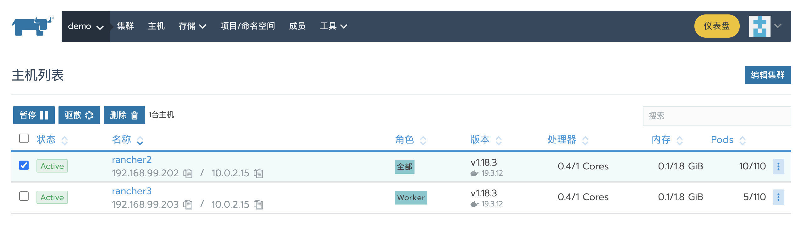 在我的环境中,demo集群有rancher2和rancher3两个节点。