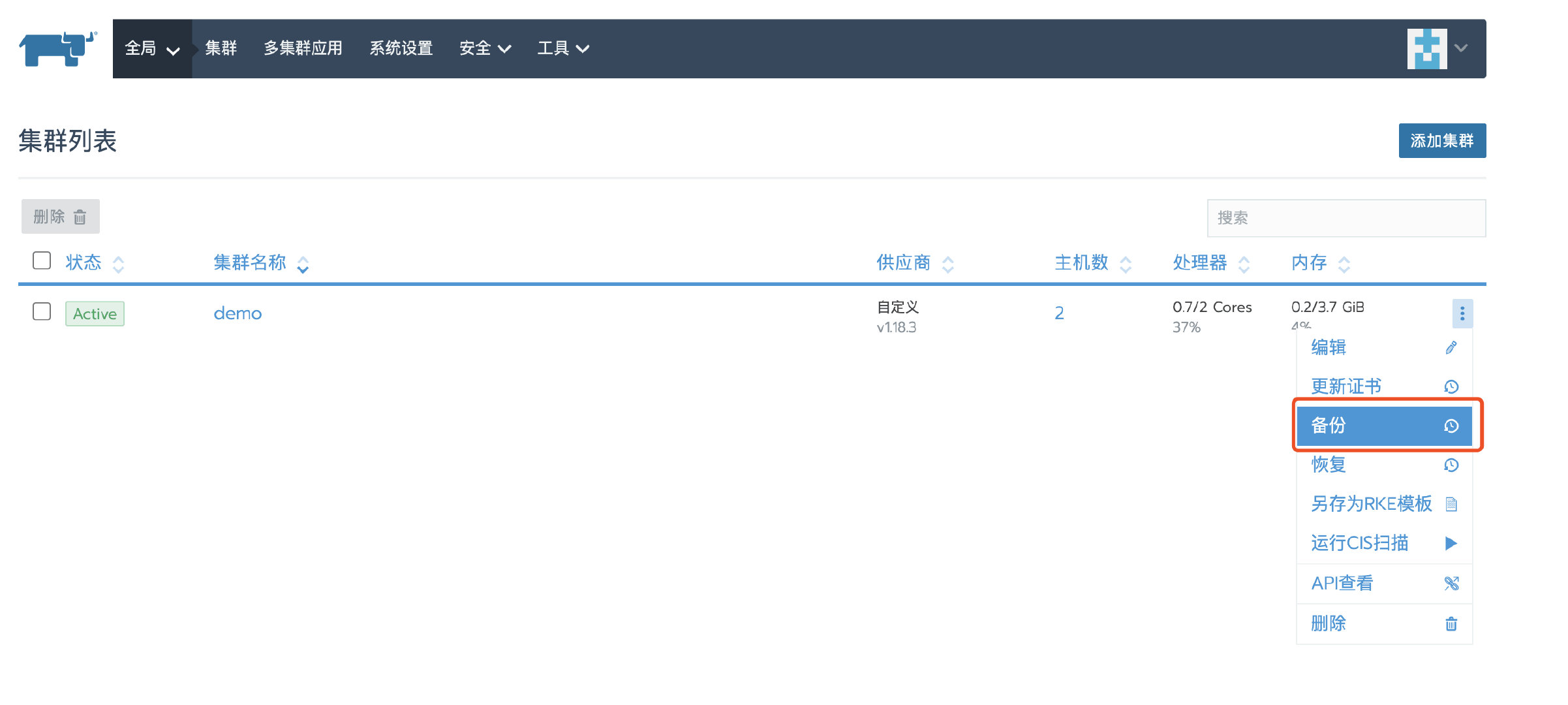 参考 https://rancher2.docs.rancher.cn/docs/cluster-admin/backing-up-etcd/_index 备份custom集群,备份成功后,可以导航到集群->工具->备份查看备份。