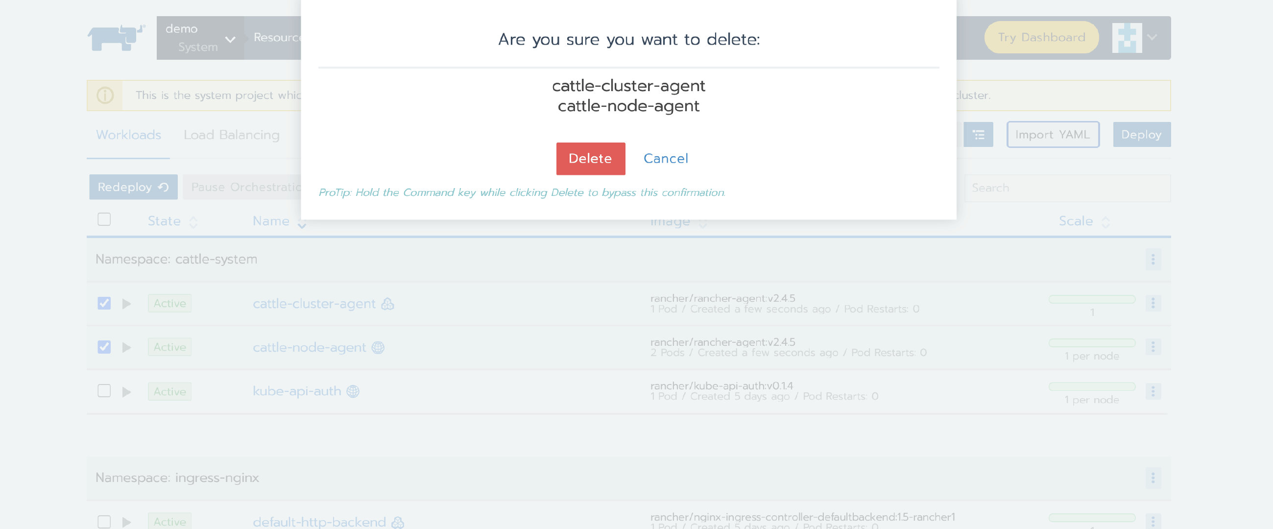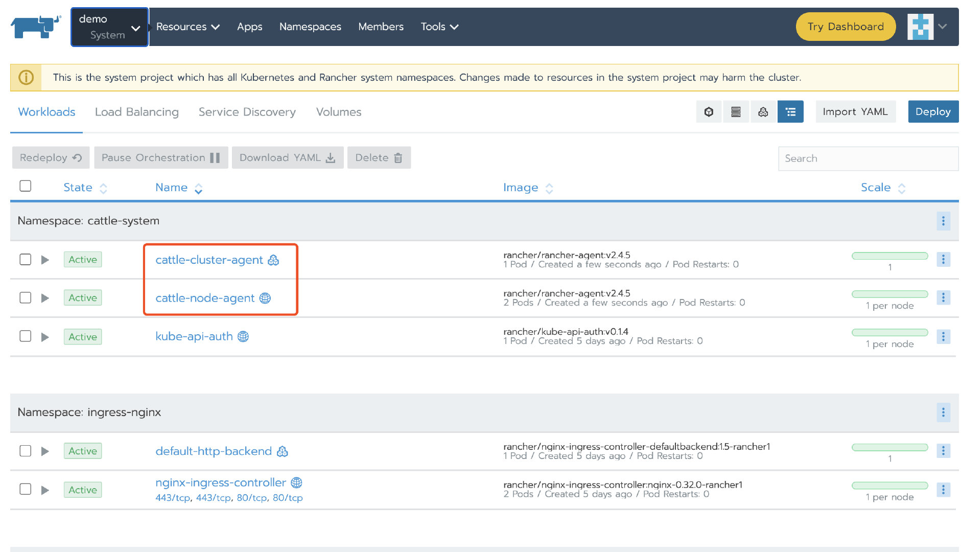 System Project中包含了一些保证该集群能够正常运行的一些workload,如果删除某些workload可能会对该集功能群造成影响。