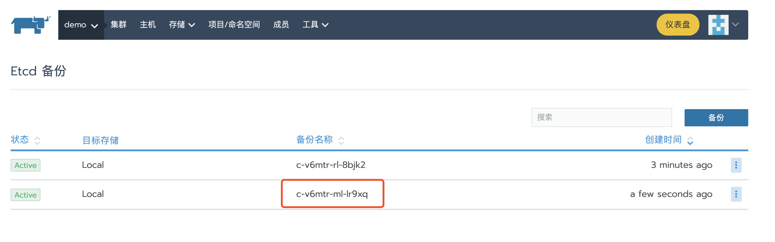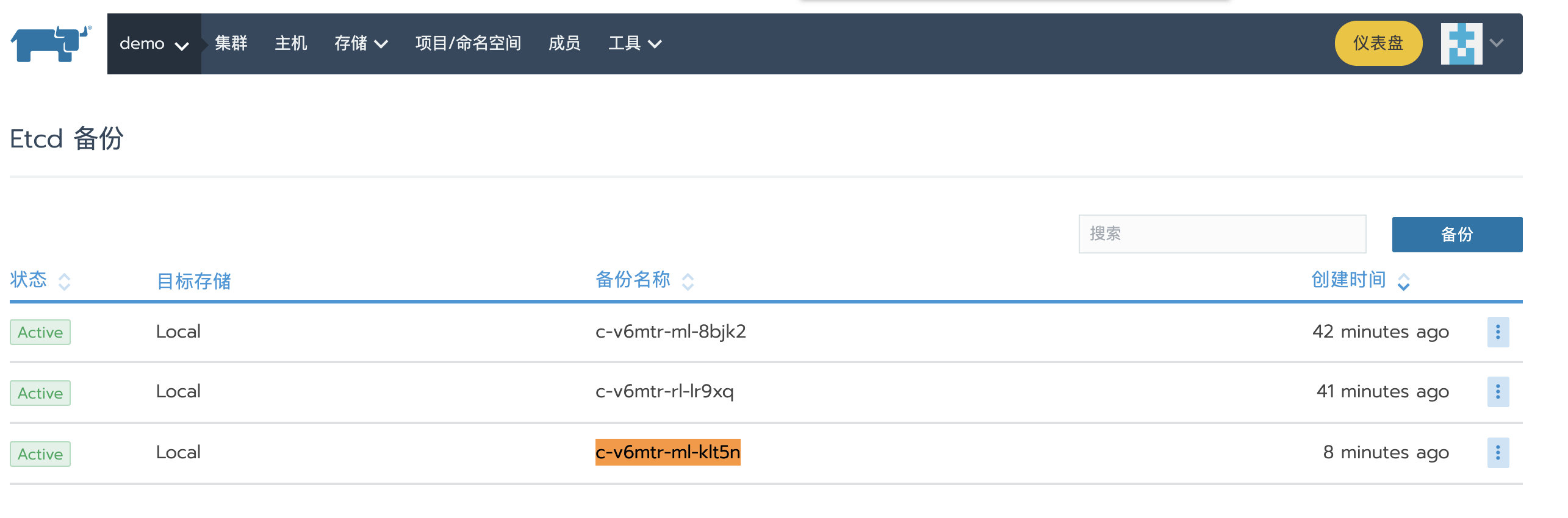 然后导航到全局->demo->工具->备份查看已经创建的ETCD备份,从备份创建时间可以看出,刚才创建的备份名称为c-v6mtr-ml-klt5n。