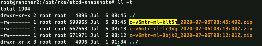 备份文件存到了etcd(rancher2)节点对应的/opt/rke/etcd-snapshots目录下。