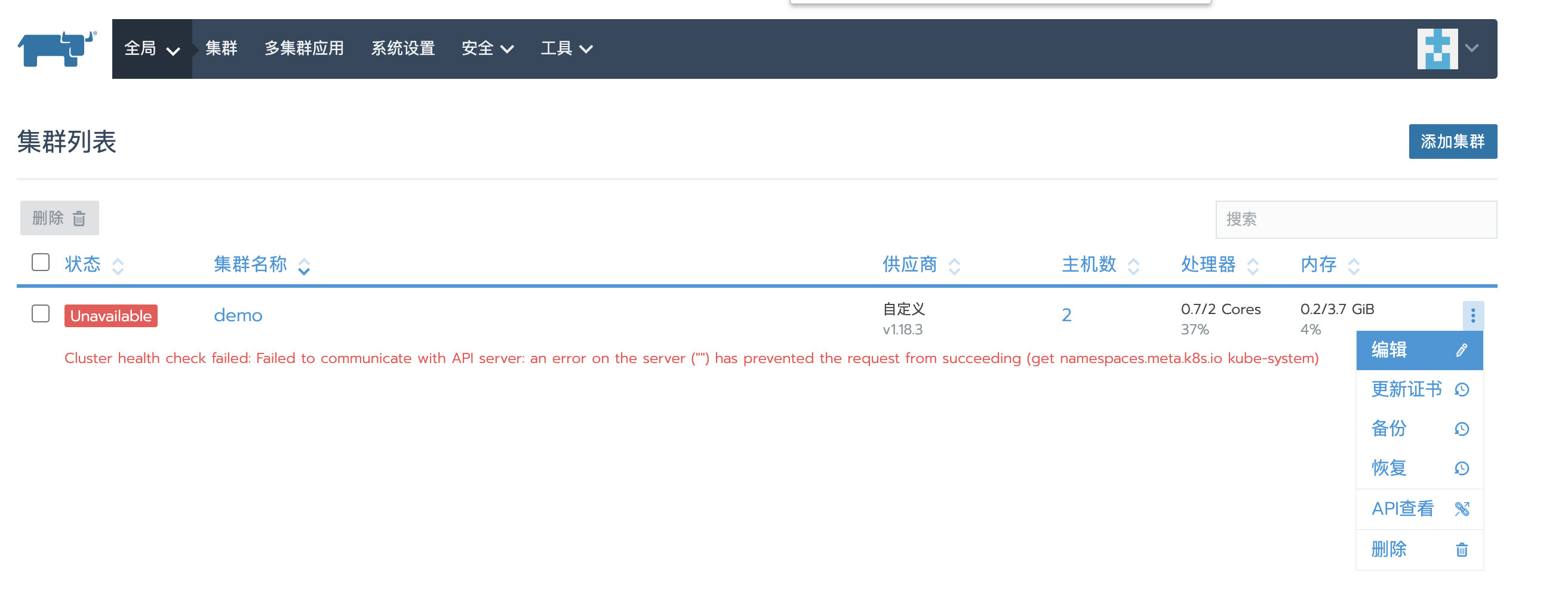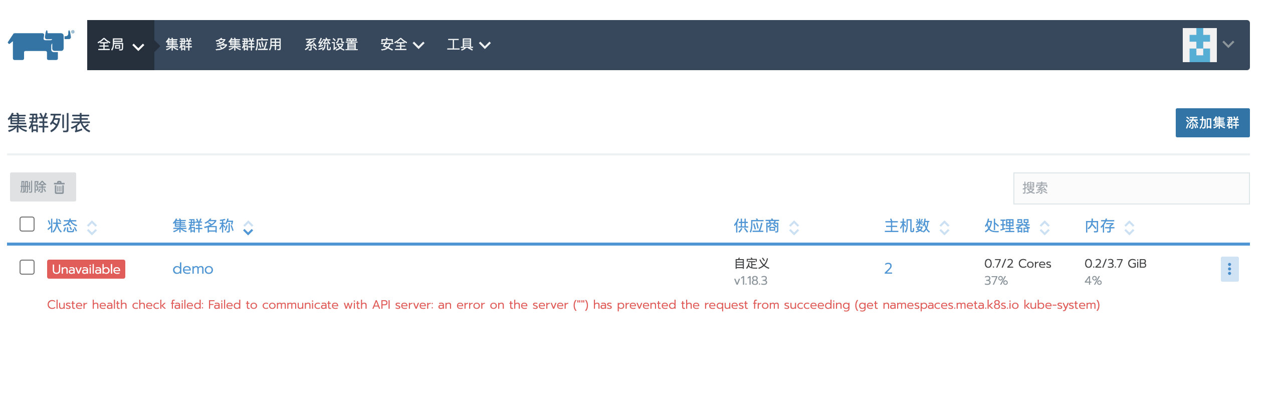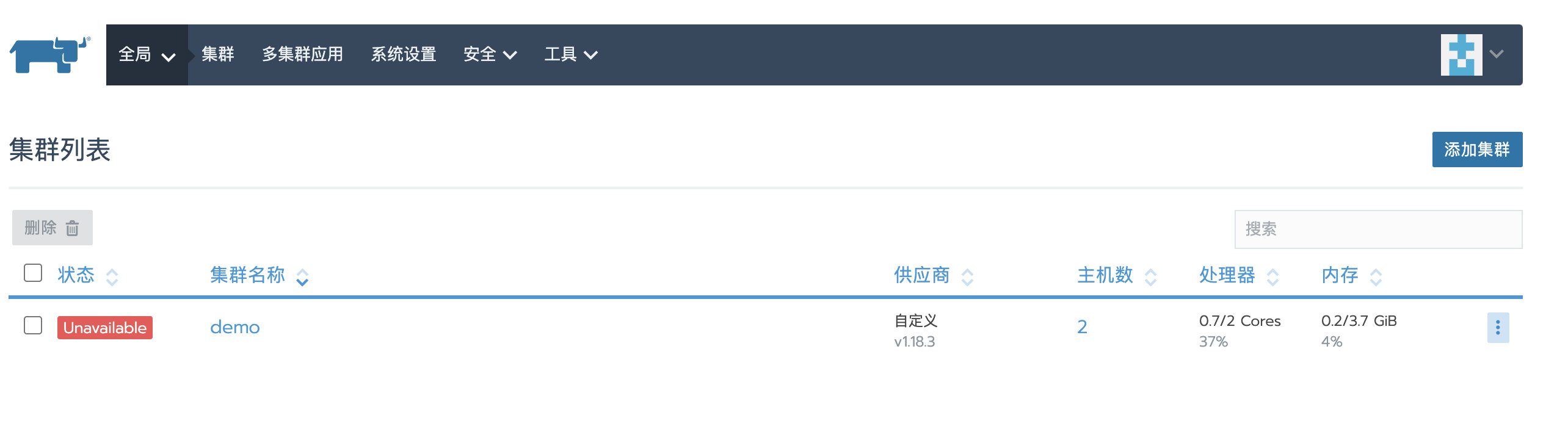 local恢复成功后,重新登录Rancher UI,可以看到刚才被删除的custom集群又重新显示了,但状态是Unavailable