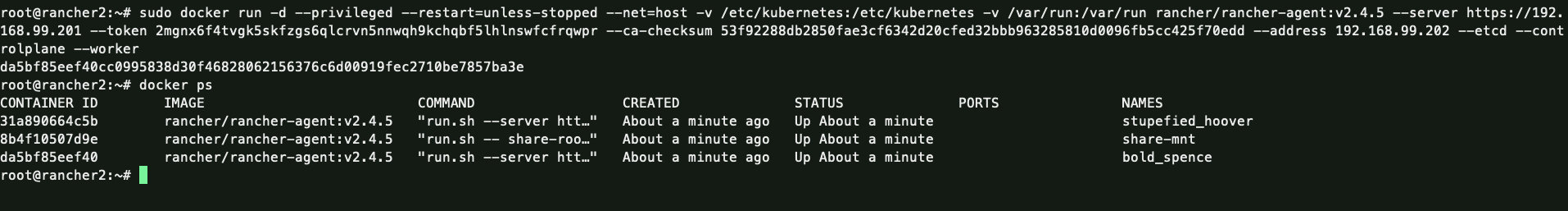 运⾏完命令之后,可以看到rancher agent已经正常工作起来了。