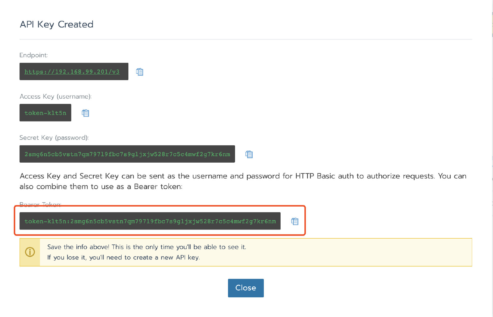 1、在Rancher UI上创建API token(用户-> API & Keys)并保存Bearer Token