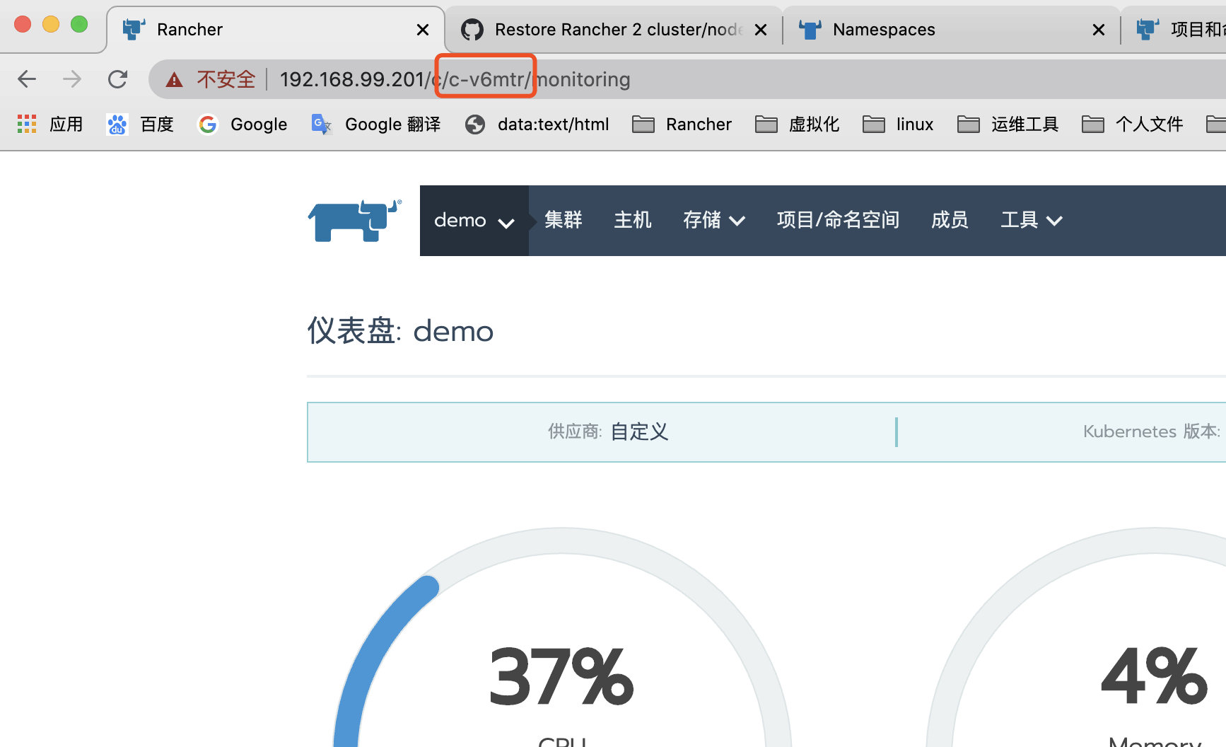 2、选择集群后,在Rancher UI(格式为c-xxxxx)中找到其clusterid,并在地址栏中找到它。