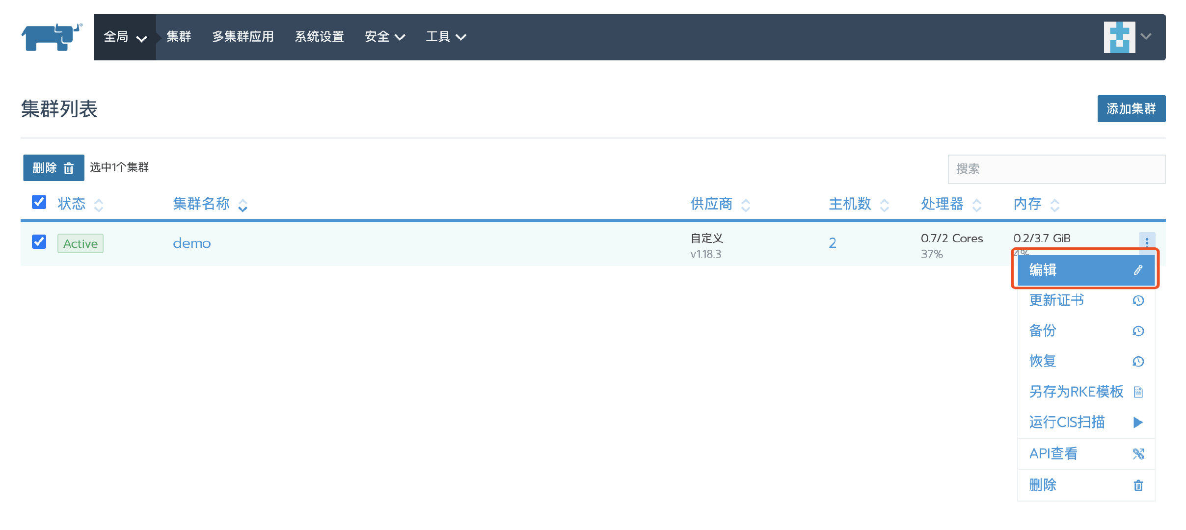 接下来,编辑集群,并且设置相同的节点参数,这地方要注意,一定要设置和之前添加节点时相同的节点参数。
