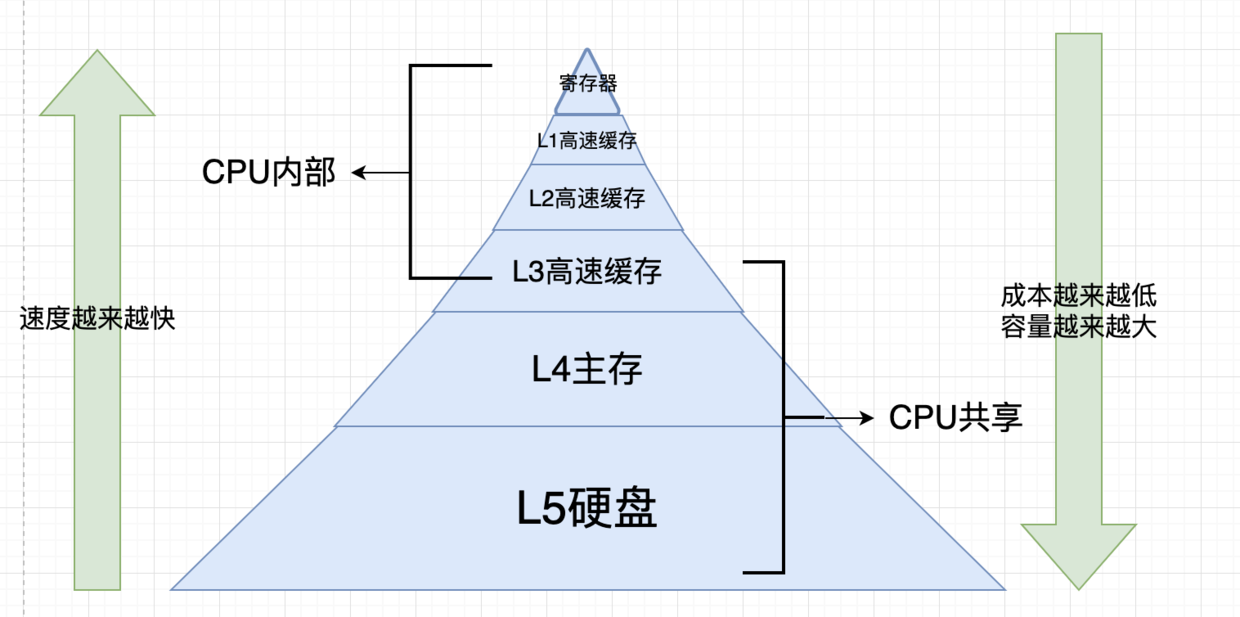寄存器中的内存最小速度最快,硬盘容量最大,速度最小,cup的第三级缓存是共享内存。