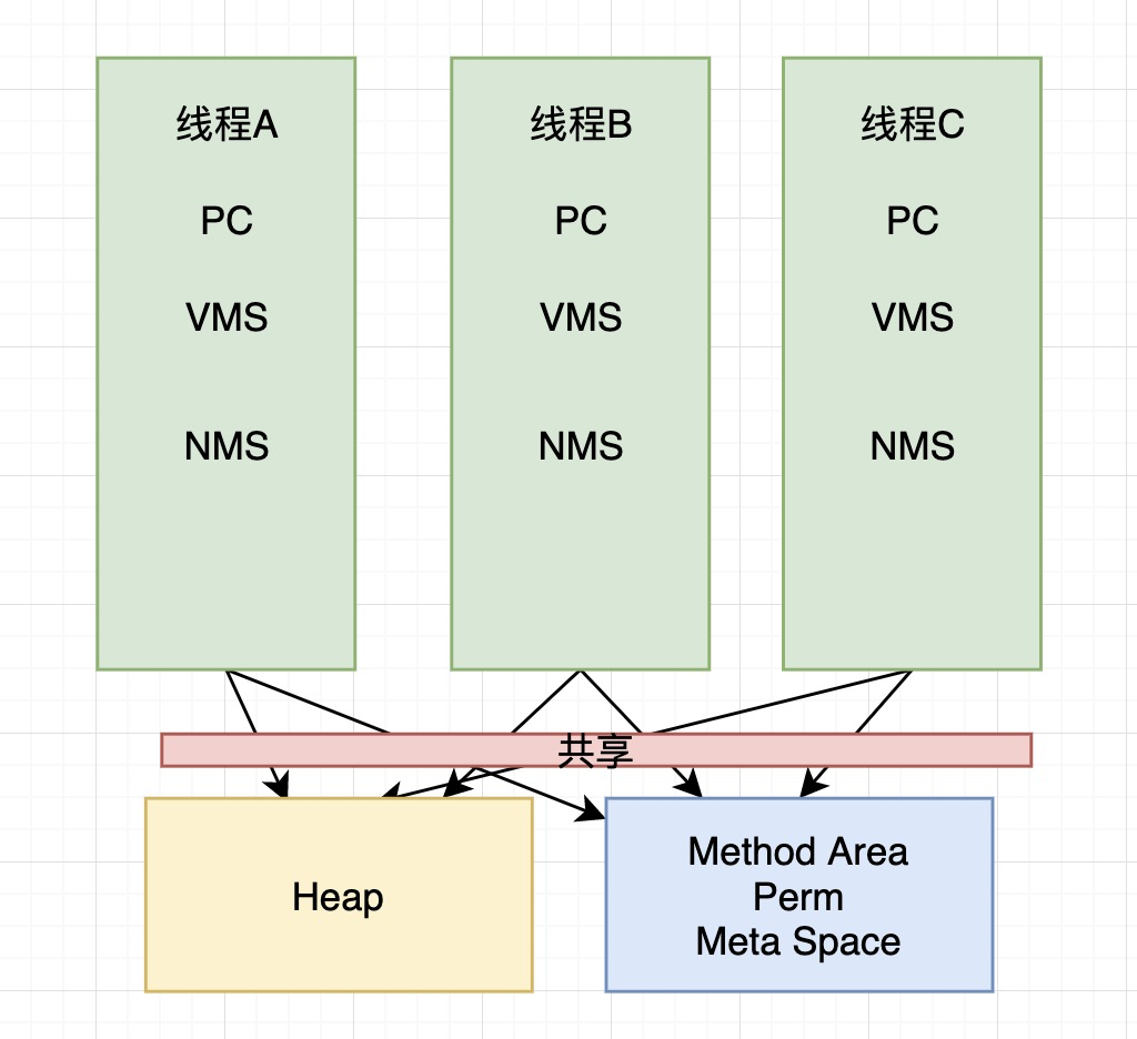 每个线程都有自己的栈内存,里面存放的是栈帧,如果有调用native方法就还存在native method stack,还有自己program counter程序计数器,用来记录每条指令的执行,当CPU切换线程的时候方便知道之前线程执行到哪条指令,所有线程共享堆内存和方法区,方法区有两种实现,在jdk8之前方法区叫PermGen永久代,jdk8及其以后的版本都叫Meta Space 元数据区。