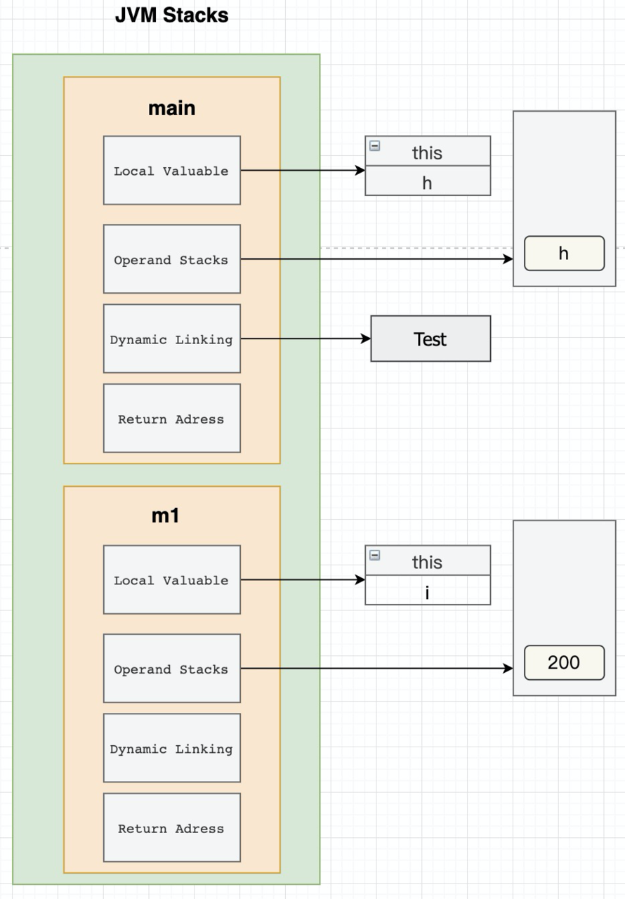 1、 首先开辟一个内存空间放在栈帧中,此时就包含了一个Dynamic Linking 动态链接的过程要把 Test h = new Test()中的Test类对应成这个类内存地址;
