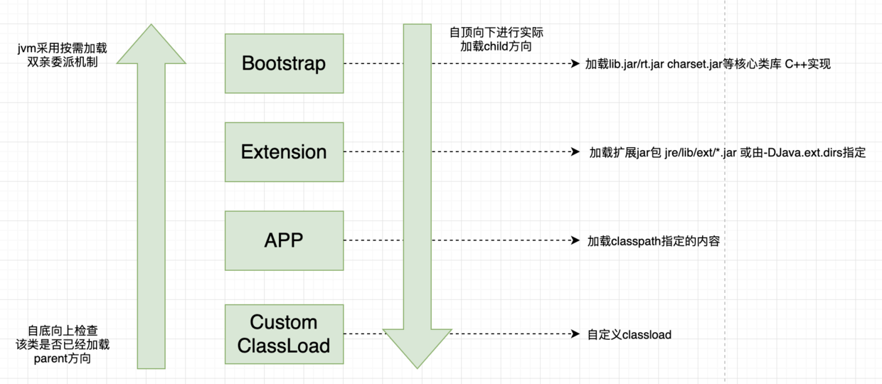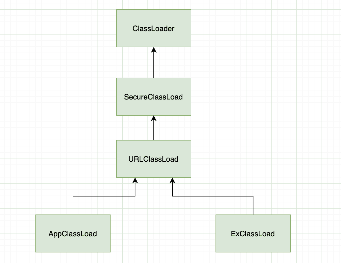 一个类被加载到内存中的过程是先按照左边的箭头方向以此判断是否已经被加载,如果到了Bootstrap发现没有被加载,则会按照有测箭头方向依次向下执行加载操作,假如我们有个自定义加载器的类第一次被加载,过程为:去查看CustomClassLoad是否已经加载=否>查看AppClassLoad=否>查看ExtensionClassLoad=否>查看Bootstrap=否>Bootstrap尝试加载,不是核心类库=>ExtensionClassLoad加载=没有找到>AppClassLoad加载=没有找到>CustomClassLoad加载成功加载或者抛出异常ClassNotFoundException,我们通常说 Bootstrap是所以加载器的父类,custom ClassLoad是底层加载器,是不是意味着上面的图就是按照Bootstrap=>Extension=>APP=>Custom ClassLoad的继承关系过来的呢?答案是否定的,上面的关系并不是按照继承的关系来的。他们是按照下图的方式继承的。比如CustomClassLoad的父加载器是AppClassLoad,是CustomClassLoad的成员变量中保存了AppClassLoad。