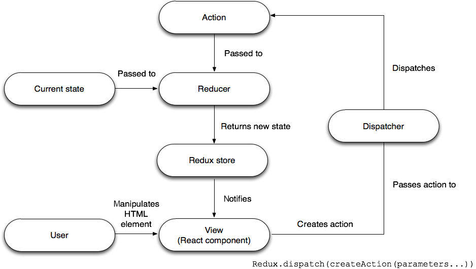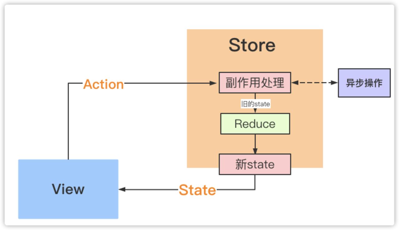 之前学习React期间接触到了Redux,第一次对基于状态管理的单向数据流架构有了一个认识,简单的公式即UI = f(state)。下面是Redux的一个架构图(看不懂,就继续往下看):