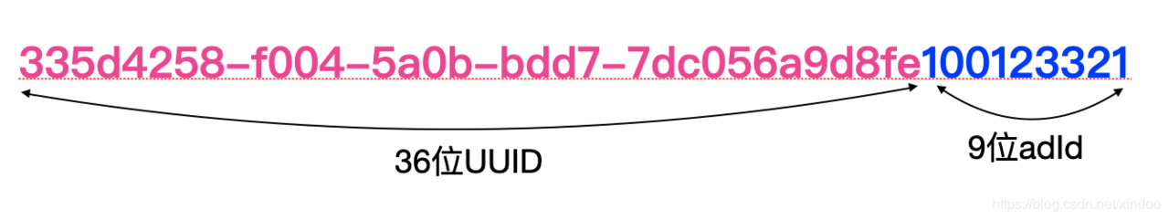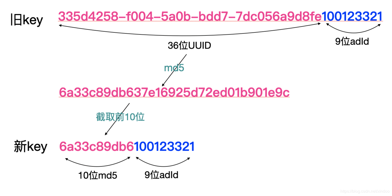 最终有效位我选取了40个有效二进制位(10个16进制位),但我并没有直接截取UUID的前10位,因为UUID的前几位和时间有关,随机性并不强。我选择将整个UUID重新md5散列,然后截取md5的前10位,然后拼接adId形成最终的key,如下图: