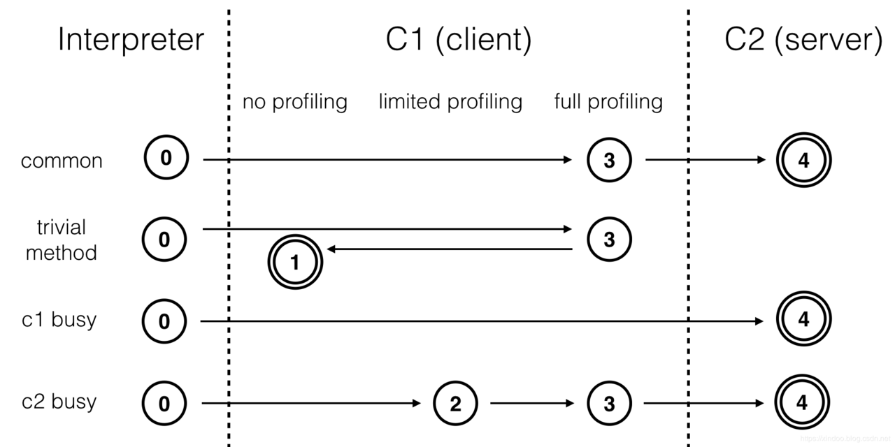 通常情况下,一个方法先被解释执行(level 0),然后被C1编译(level 3),再然后被得到profile数据的C2编译(level 4)。如果编译对象非常简单,虚拟机认为通过C1编译或通过C2编译并无区别,便会直接由C1编译且不插入profiling代码(level 1)。在C1忙碌的情况下,interpreter会触发profiling,而后方法会直接被C2编译;在C2忙碌的情况下,方法则会先由C1编译并保持较少的profiling(level 2),以获取较高的执行效率(与3级相比高30%)。