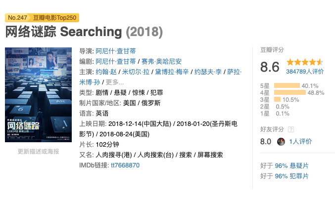 工程师大卫·金(约翰·赵 饰)一直引以为傲的16岁乖女玛戈特突然失踪。前来调查此案的警探怀疑女儿离家出走。不满这一结论的父亲为了寻找真相,独自展开调查。他打开了女儿的笔记本电脑··· ···
