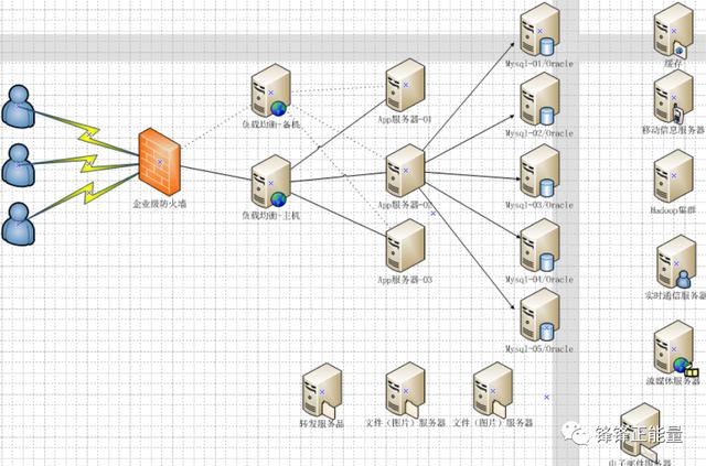 最前面的是企业级防火墙,后面通过负载均衡主机(软负载:Nginx,硬负载:F5)在 web 服务器集群之间进行调度,再由具体的 web 服务器(Tomcat)去访问缓存,访问数据库。