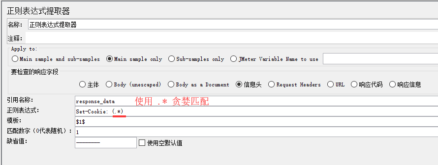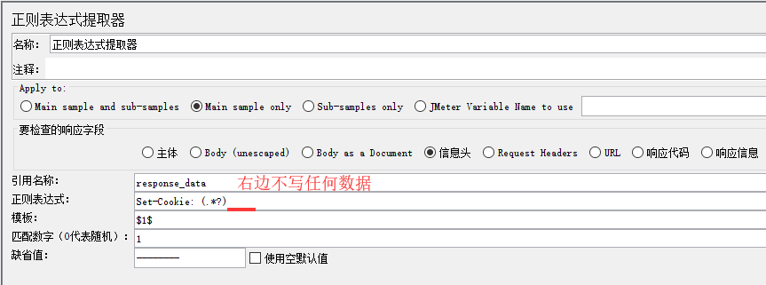 接下来,我们便设置一个正则提取器(用于提取出cookie),另外再设置一个调试后置处理程序(用于查看提取结果)